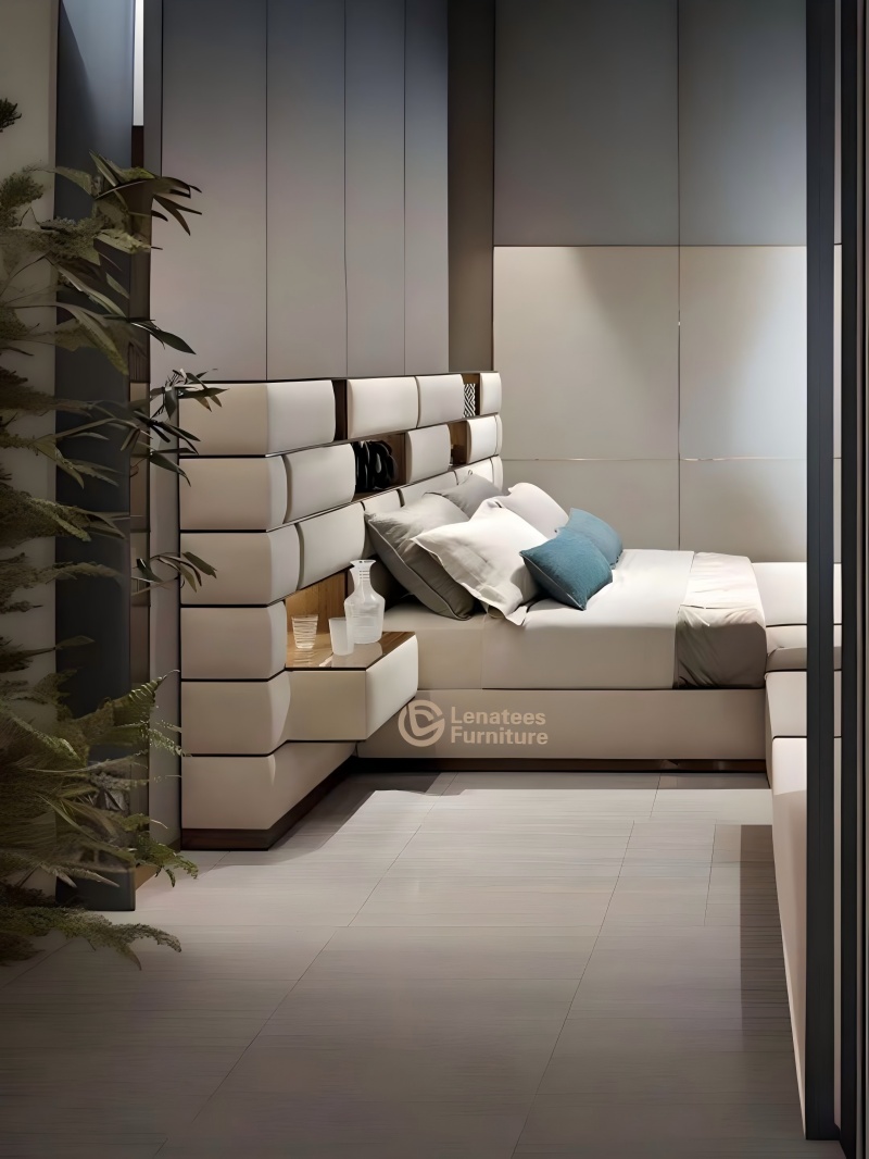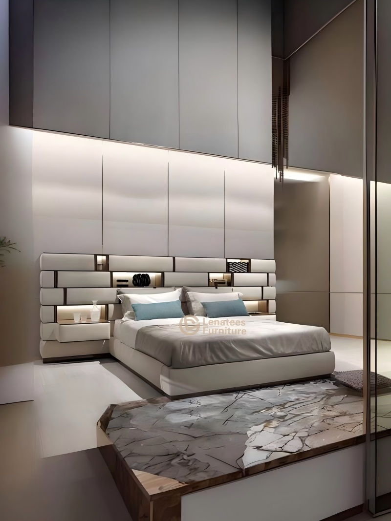 Valittu 304 ruostumattomasta teräksestä valmistettu kromipinnoitettu laitteisto yhdistetään tuotuihin yläjyvälehden/samettihallin pehmeisiin laukkuihin, jotta luodaan makuuhuoneen päähenkilö, joka yhdistää teollisen tekstuurin mukavan kokemuksen.